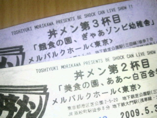 前回よりもパワーアップして帰ってきたってな感じで、今回も見るも無残な・・・(汗)丼たちが登場する素敵なイベントでした。 丼メンのメインは森川さんと宮田さんvv「おまえら」とはちょっと雰囲気の違うイベントになっております。 今回のゲストは浪川さんと吉野さんのお二人、昼の部では女子高生、夜の部ではゾンビ幼稚園児(爆)姿のお二人を見て大笑いvv 吉野さんの女装姿はなんどか拝見したことあるのですが、浪川さんってば・・・とってもキレイ(^^;新たな一面を見た気がします。 会場全体が阿鼻叫喚する恐怖のイベント?!(笑)ですが、終わったあとにはきっと丼が食べたくなる?←いやならない?! そんな不思議なイベント「丼メン」に是非機会があったらご参加ください(^^) ちなみに・・・お昼はお蕎麦屋さんで親子丼を食べましたよ~。